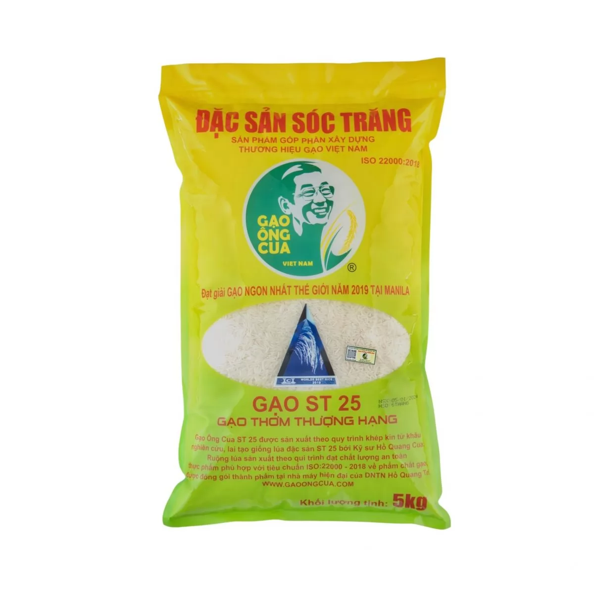Sản phẩm gạo ngon ST25 Ông Cua đóng gói 5kg là sản phẩm bán chạy nhất nhiều năm liền, Gạo ngon ST25 Ông Cua 5kg được đóng gói trong túi Nilon cứng, đẹp đảm bảo chống mưa gió và ẩm ướt. Sản phẩm gạo ST25 Ông Cua được nghiên cứu vào gieo trồng theo đúng các tiêu chuẩn về an toàn vệ sinh thực phẩm và được gieo trồng trên vùng đất Sóc Trăng màu mỡ nên sản phẩm có chất lượng tốt nhất, an toàn nhất khi sử dụng.