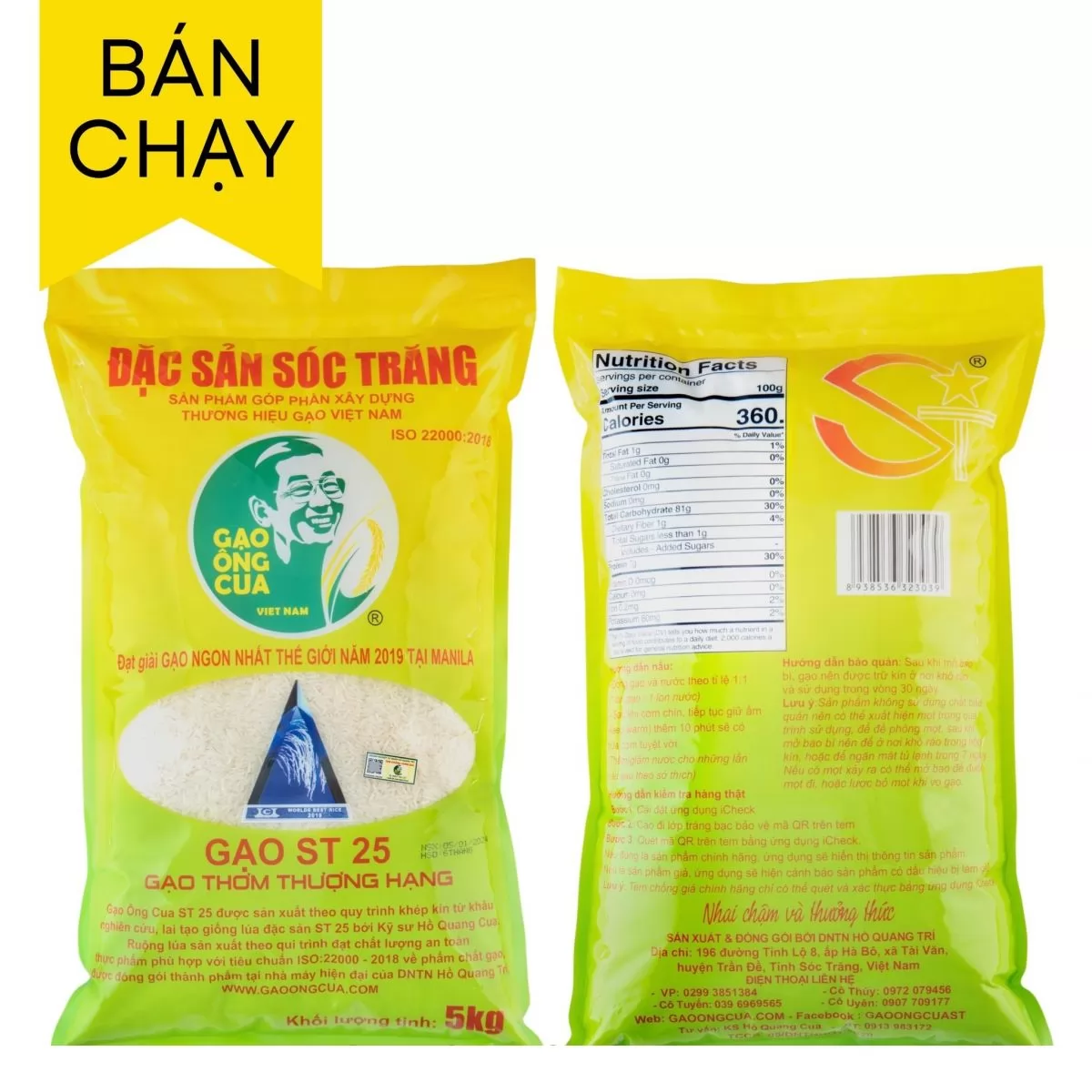 Gạo ngon ST25 Ông Cua được doanh nghiệp Hồ Quang Trí sản xuất và đóng gói theo tiêu chuẩn ISO 22000: 2018 và HACCP nên hoàn toàn yên tâm về độ chuẩn của bao bì, trọng lượng, chất lượng sản phẩm. Trên bao bì của sản phẩm gạo ngon ST25 Ông Cua được trình bày khá đầy đủ về thông tin sản phẩm như: Hạn sử dụng, trọng lượng, cách sử dụng sản phẩm đẩy đủ.